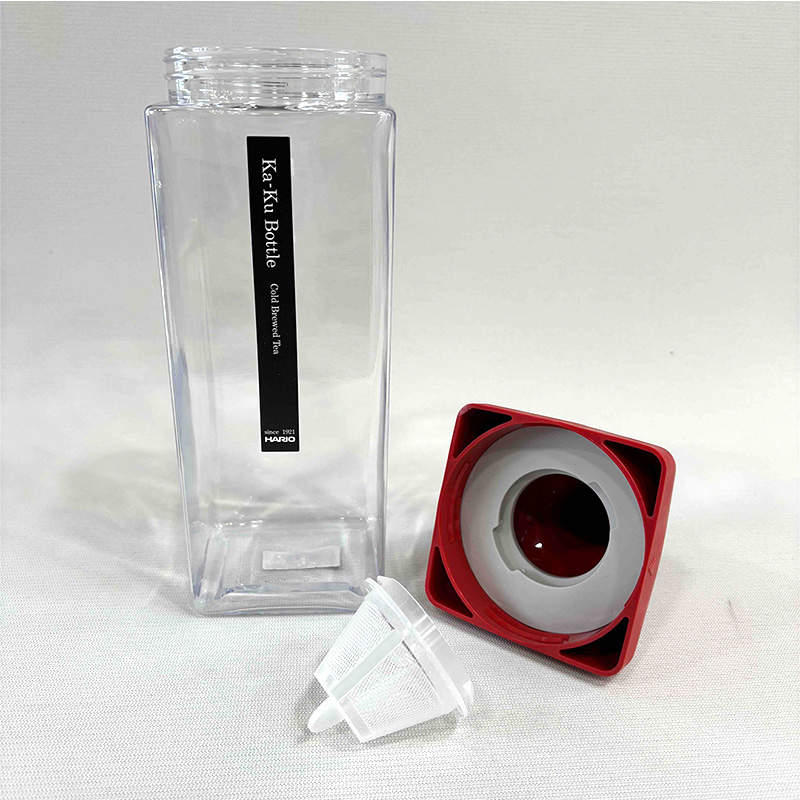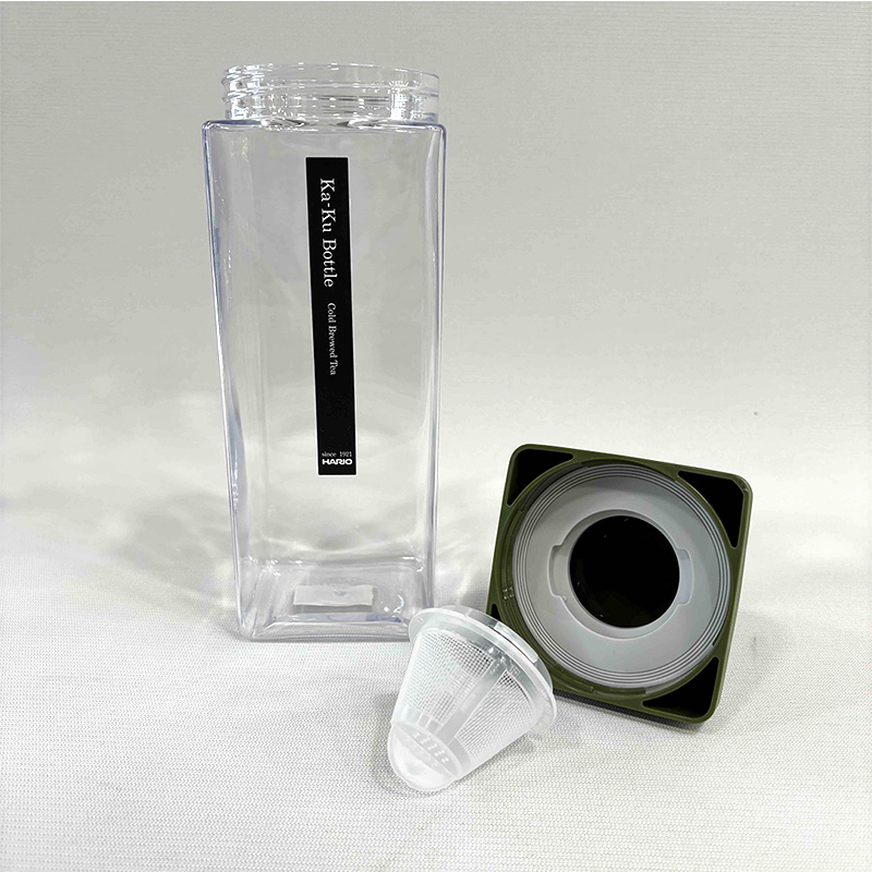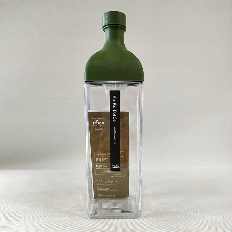 本体ボトル部分がPCT樹脂の角型ボトルです。冷蔵庫の棚に横置きやドアポケットにも収納できます。注ぎ口内側にフィルターが付いているので水出し茶を作ることもできます。注口部分にフィルターがセットされているのでそのまま注げます。