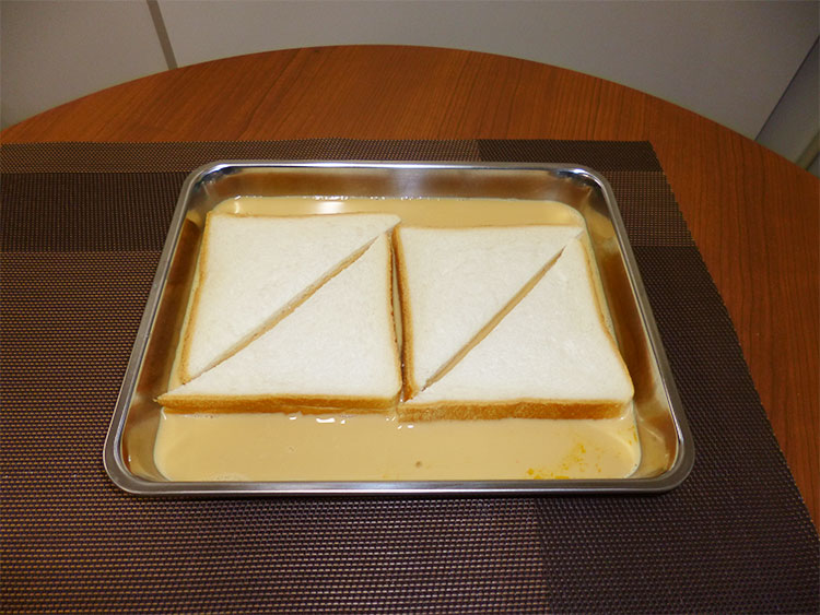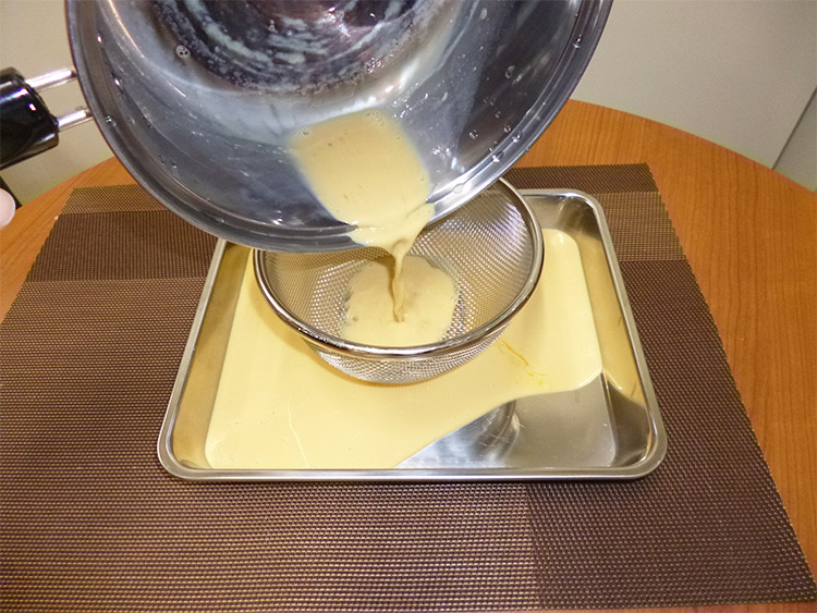 3卵、砂糖を加えて混ぜ合わせ、こしながらバットに移します。