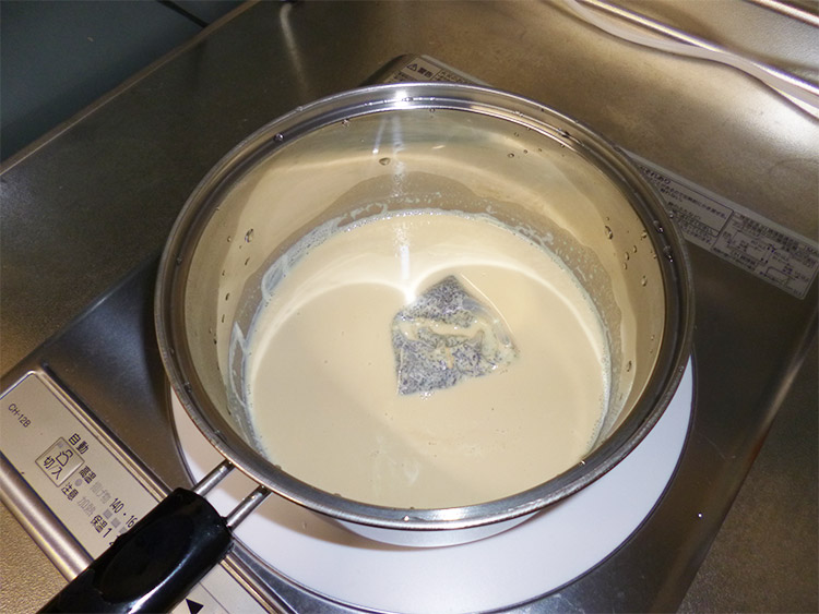 2鍋に牛乳、紅茶のティーバックを入れて弱火で加熱します。沸騰の直前まで温めたら火を止め、粗熱を取ります。