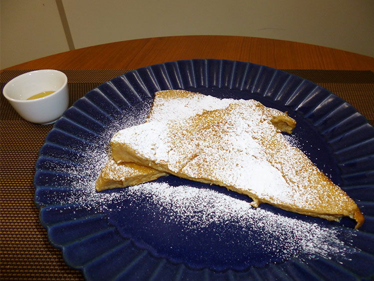 7火からおろしてお皿に盛りつけ、粉糖とはちみつをかけて完成です。