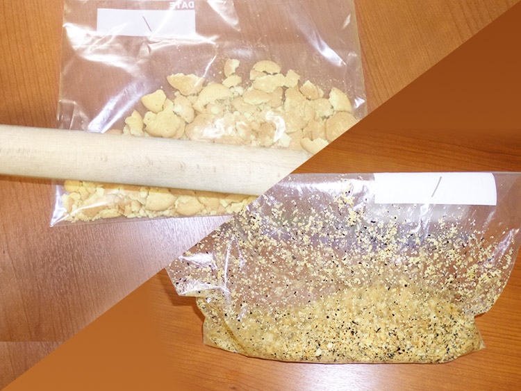 2ビニール袋にビスケットを入れて、めん棒などで砕き、ティーバックの中身を1袋分と溶かしバターを加え、揉んで全体をなじませる。