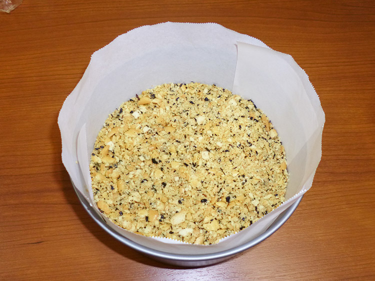 3型にクッキングシートをしいて揉んだビスケットを入れて、ラップをかぶせて上から押して底にしいて、底生地を作る。