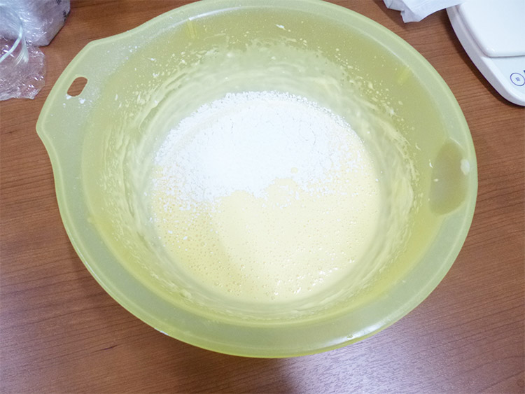 5ボウルにクリームチーズと砂糖を入れてクリーム状になるまで混ぜ、卵、紅茶液、レモン汁の順に加えてその都度よく混ぜ、薄力粉をふるって加えて混ぜて生地を作る。