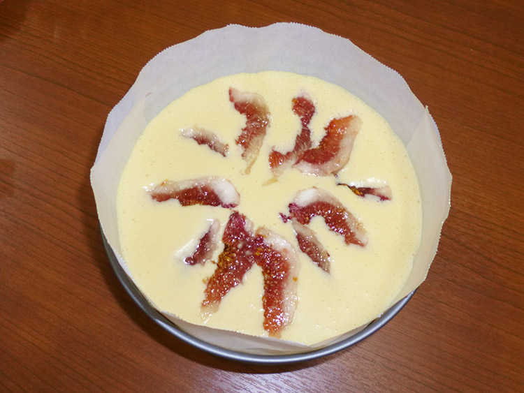 6型に生地をこしながら流し入れて上にいちじくを並べる。180℃に予熱したオーブンで40分程度焼き完成。