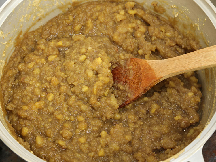 4別の鍋に3と砂糖、水を入れ中火にかけ、木べらで栗を潰しながら混ぜます。