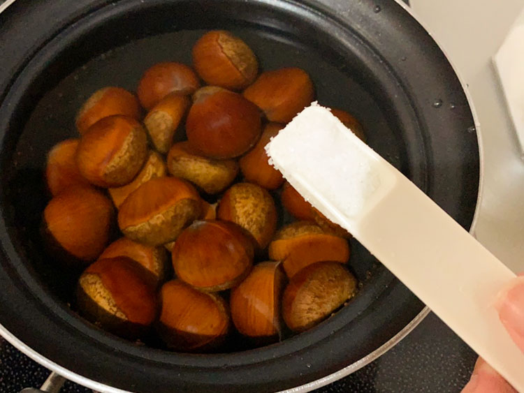 1鍋に栗を入れ、たっぷりの水をいれて、中火で一時間程度栗に 火が通るまで茹でます。