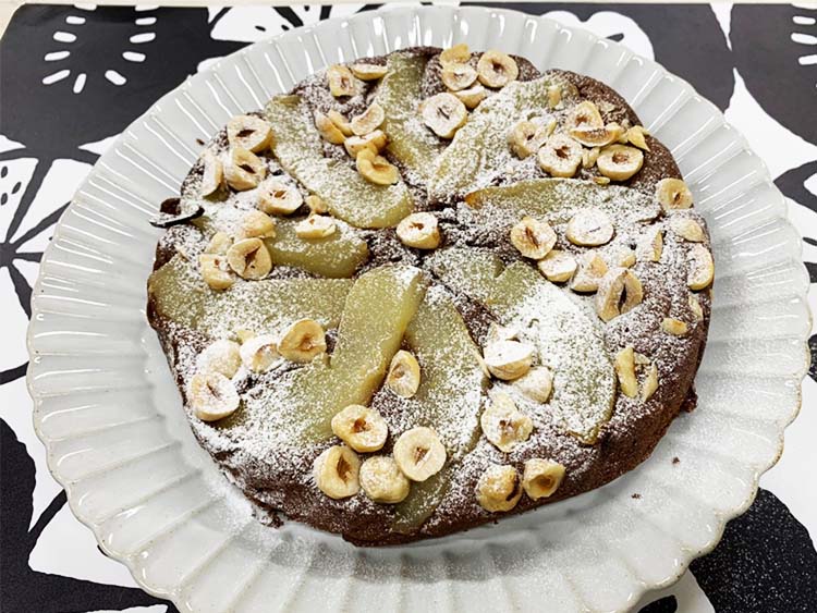 9型に生地を流し入れ、洋梨を並べ、上にヘーゼルナッツを散らします。