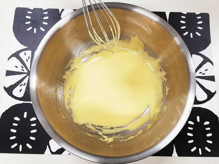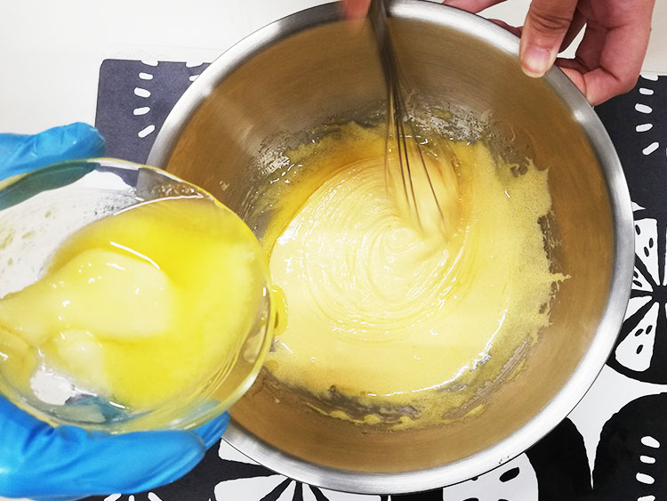 4バターを少しずつ混ぜ合わせます。マヨネーズのような感じになるまでしっかり混ぜます。