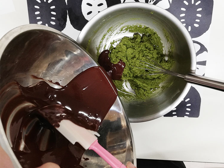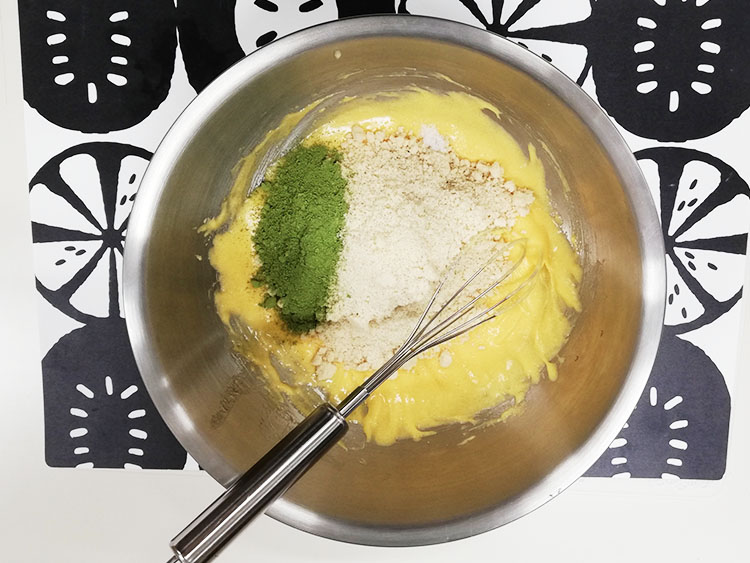 5アーモンドプードルと抹茶、塩を加えて混ぜ合わせます。