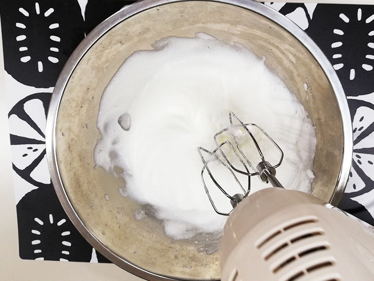 7メレンゲを作ります。卵白を電動ミキサーやスタンドミキサーで泡立て、グラニュー糖を2~3に分けて加えます。