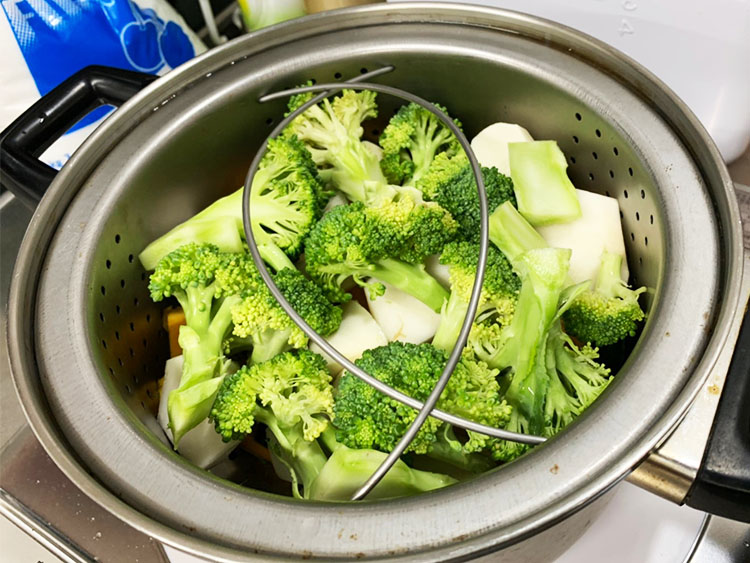 1里芋は皮をむいて、かぶは皮をむき、かぼちゃとともに食べやすい大きさに 切ります。ブロッコリーは小房にわけます。
