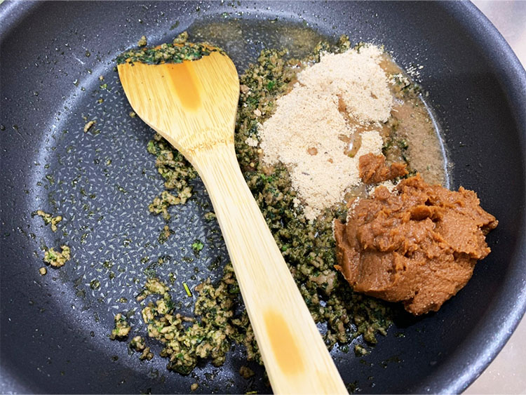 41度火を消して、3に★を加えて混ぜ、再び火にかけます。全体がよくなじんだら火からおろして、できた肉味噌を器に入れます。