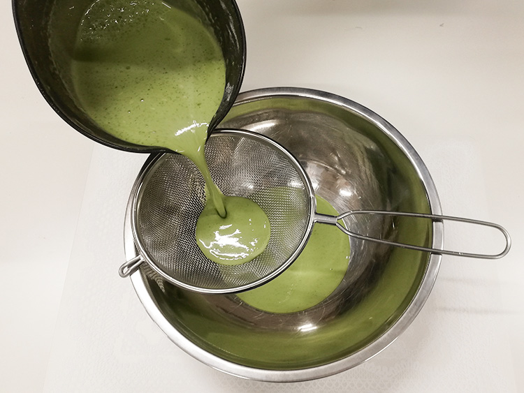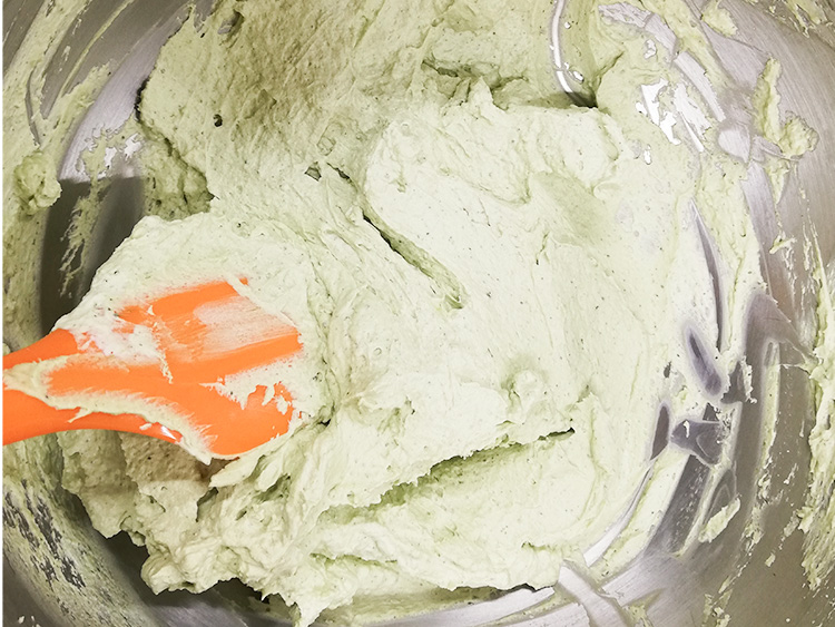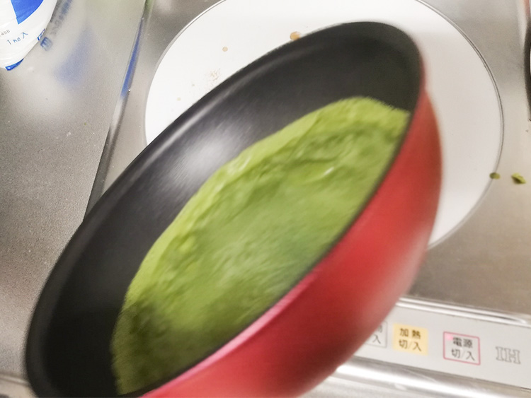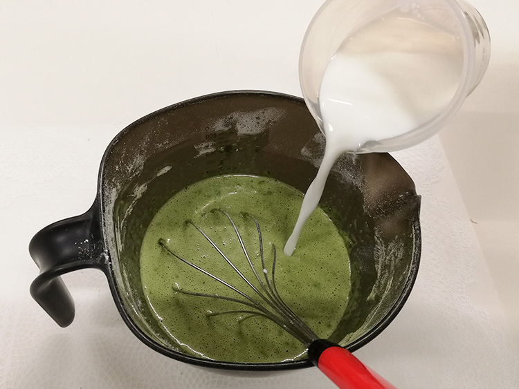 9クリームチーズと「8」を少しずつ入れよくかき混ぜる。抹茶ペーストも入れ、混ぜ合わせる。