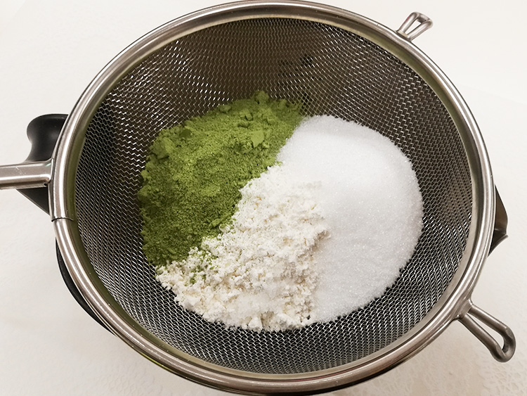 1ボウルに薄力粉、抹茶、グラニュー糖、塩を入れ、混ぜ合わせる。