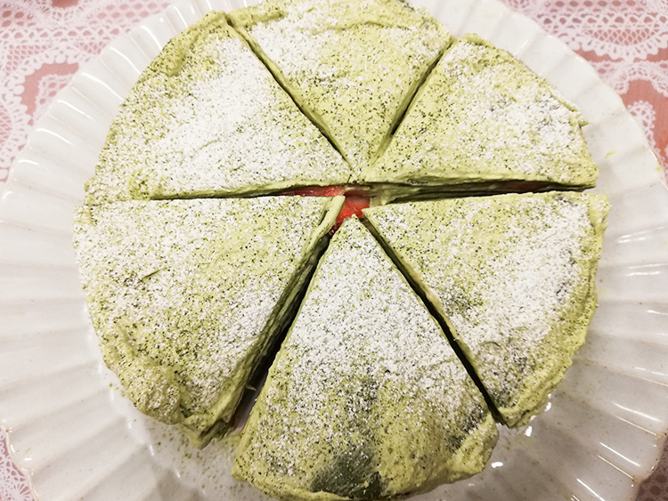 12側面と上にも抹茶クリームを塗り、食べる直前に抹茶と粉糖をふりかける。