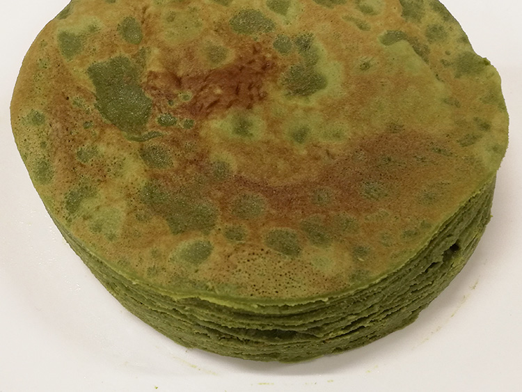 11大きさを整えたクレープに抹茶クリームを塗り、いちごを並べ重ねていく。