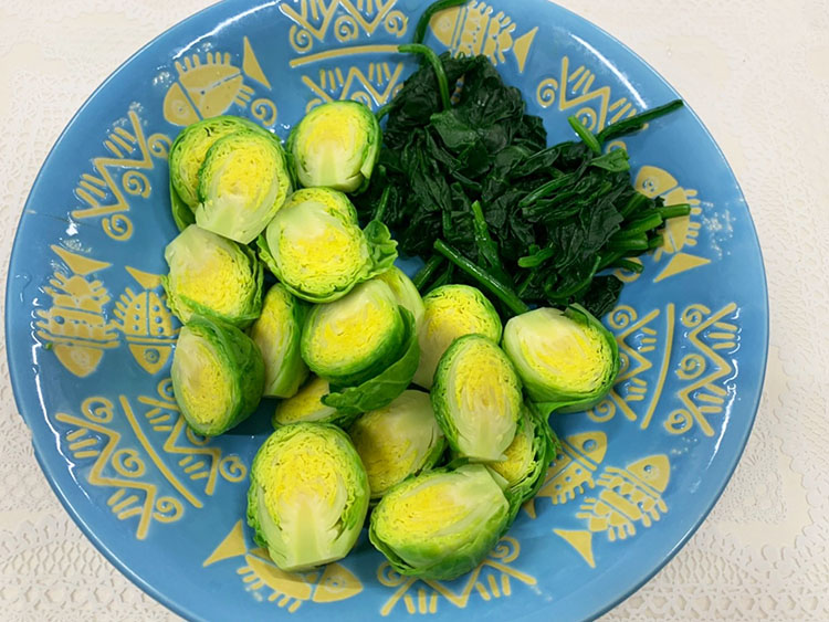 1芽キャベツとほうれんそうは下湯でし、水気を切って、芽キャベツは半分にほうれん草は2㎝幅に切っておく。