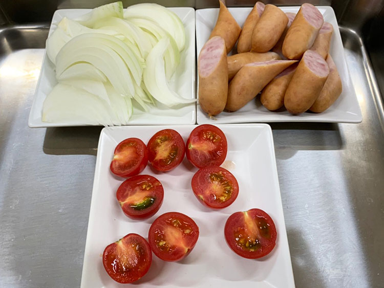 2ソーセージは斜め2等分、玉ねぎは1センチ幅のくし形に切る。プチトマトはへたを取り半分に切る。