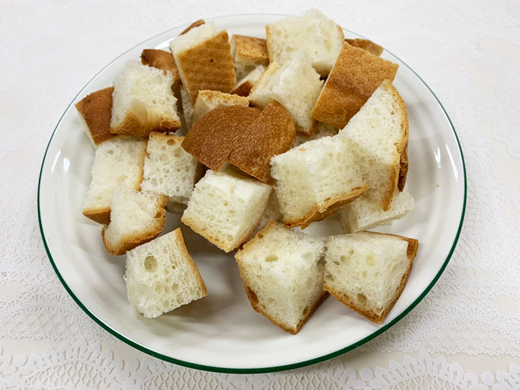 3フランスパンは2㎝角に切る。