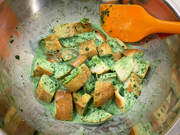 4少し温めた牛乳に抹茶、塩、こしょうを混ぜ、3のフランスパンを入れ、浸しておく。
