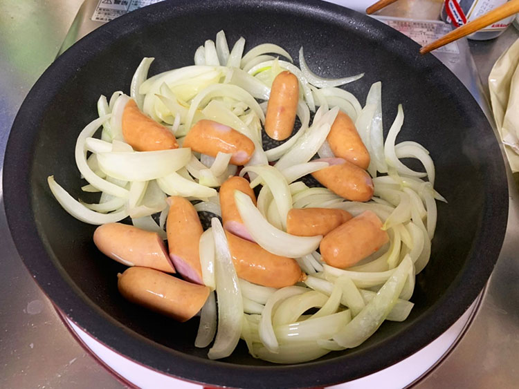 5フライパンにオリーブオイルを入れ玉ねぎとソーセージを炒める。