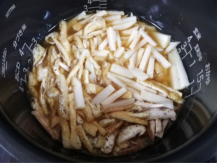 - タケノコ(あく抜きしたもの。水煮でも)…150g