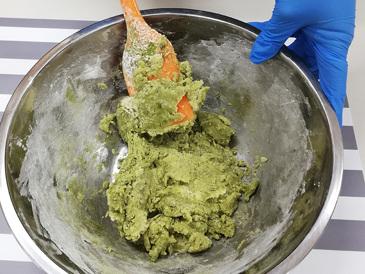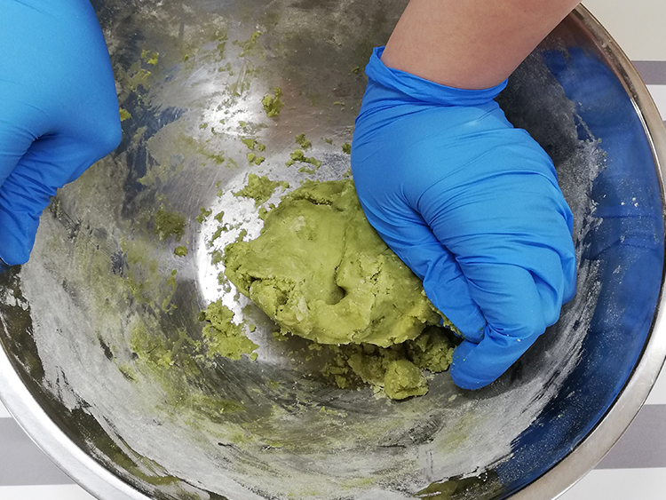 5ある程度まとまってきたらゴム手袋をつけて生地をひとつにまとめる。オーブンを170℃に予熱する。