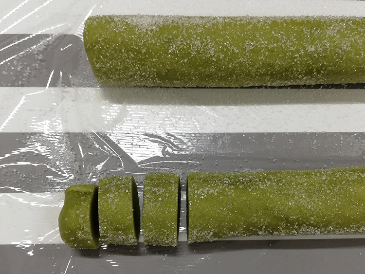 62等分して細長く丸め、 生地の上からグラニュー糖をまぶし、1㎝くらいの厚さに切り、鉄板に並べる。