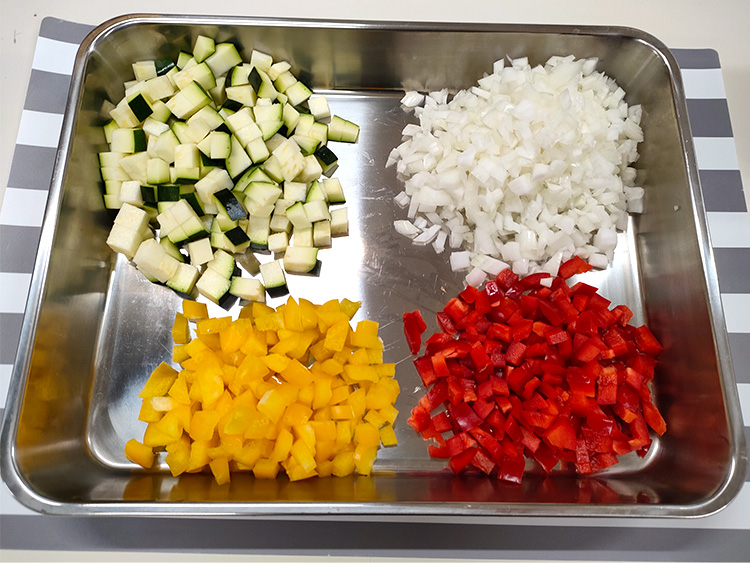 3パプリカ、ズッキーニ、タマネギをみじん切りにします。