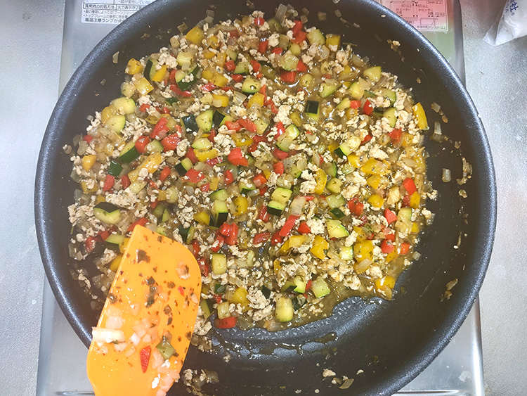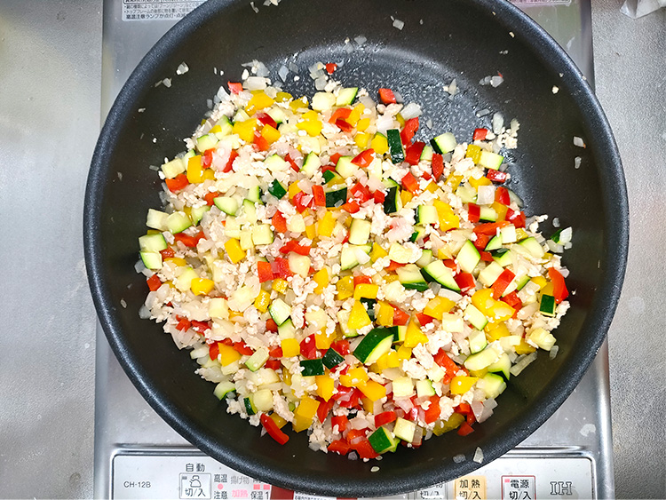 5パプリカとズッキーニを加えて軽く炒め、出た水分をキッチンペーパーで吸い取ります。