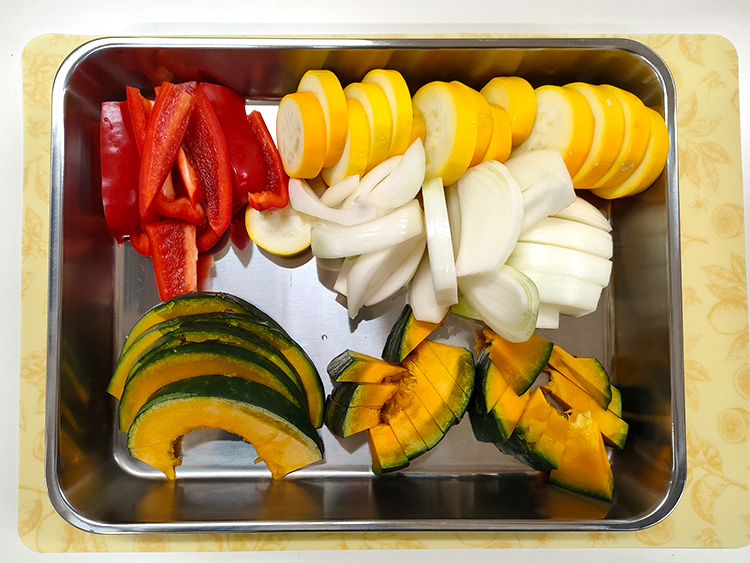 1鶏もも肉は1口大、タマネギはくし切り、ズッキーニは輪切り、パプリカは縦に切ります。