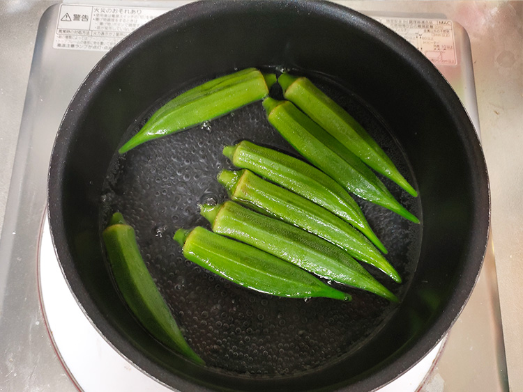 3オクラは軽く塩茹でし、氷水で冷やしヘタを取ります。6本はトッピング用にそのまま、残りは半分に切ります。