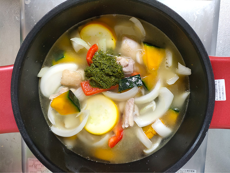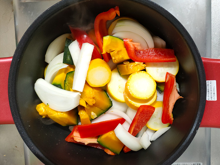 4鍋にオリーブオイルを熱し、鶏もも肉に火が通るまで炒めます。トッピング用とオクラ以外の野菜も入れて、さらに炒めます。