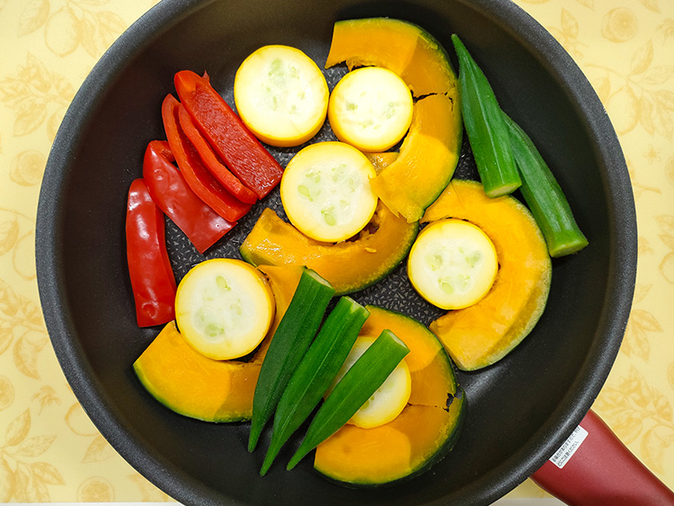 8オクラ以外のトッピング用の野菜をレンジでラップをして、1分半ほど加熱します。フライパンでオクラも一緒に焼いて、お皿に盛りつけます。