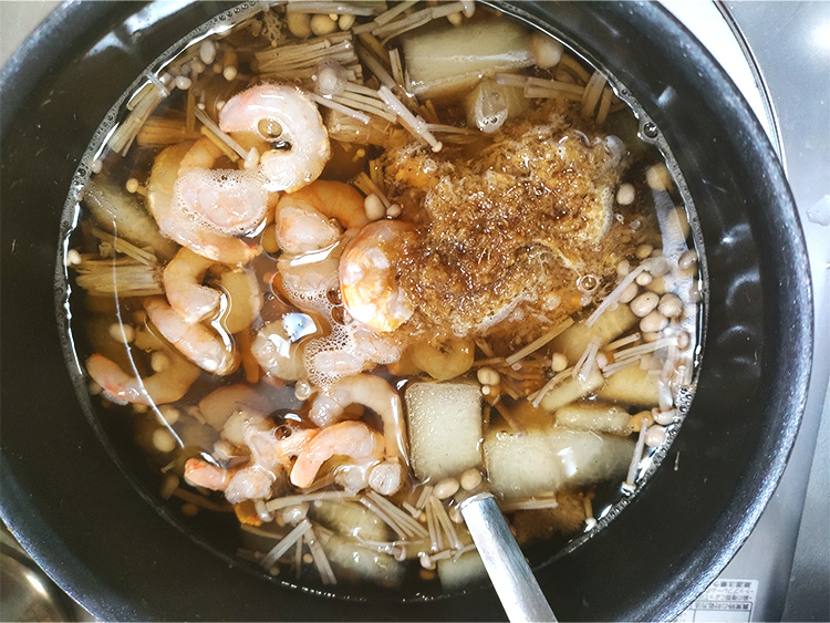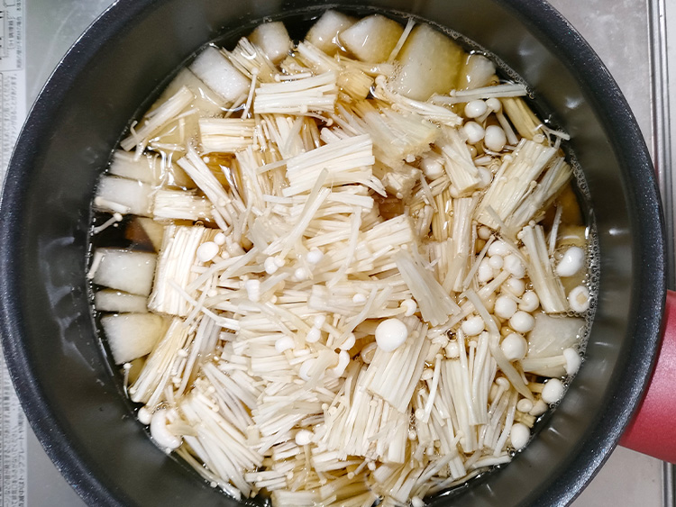 2わたと種を取り、1口サイズに切った冬瓜と、長さを3等分にしたえのき茸、①のほうじ茶を鍋に入れて蓋をし、沸騰させます。