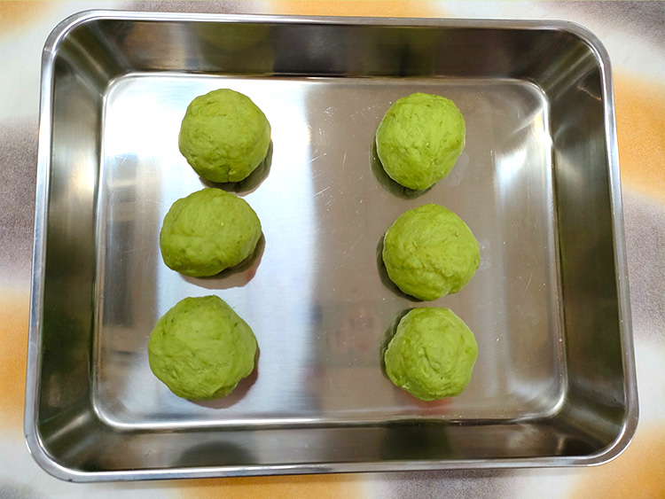2バットに、6等分に丸めて並べ、濡れた布巾をかけて10分間おきます。