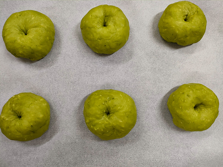 3生地をベーグルの形に成形し、クッキングシートを敷いた鉄板に並べ、オーブン発酵機能の35度で30分発酵させます。