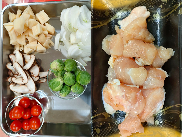 1新玉ねぎと椎茸は薄切り、れんこんは皮を剥いて乱切りにします。ミニトマトはヘタを取り、芽キャベツは固いところを取っておきます。鶏肉は一口大に切り、塩コショウしておきます。