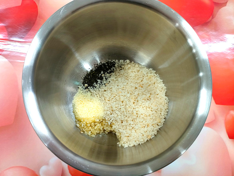 2ボウルに茶葉、粉チーズ、パン粉入れ、オリーブオイルの大さじ2を入れて混ぜ合わせます。