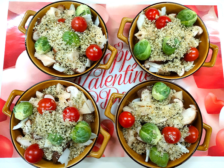 3耐熱容器に野菜を並べていれ、②を振りかけ、軽く塩コショウを振ります。