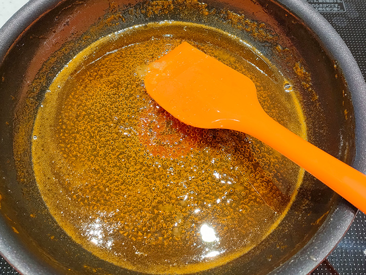 2【カラメルソース作り】鍋にグラニュー糖と水を入れて中火にかけ、まわりが焦げ付いてきたら鍋をゆすりながら濃いこげ茶いろになるまで焦がす。火を止めて、果汁を加え混ぜる。