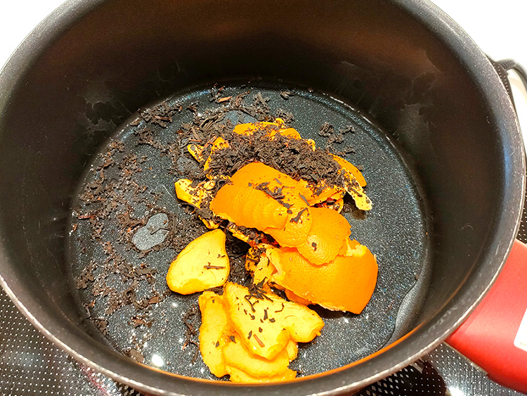 3鍋に水50mlを入れ火にかけ、沸騰したら茶葉とせとかの皮を入れて火を止める。蓋をして15分程蒸らす。牛乳を加えて再度火にかけ、沸騰直前まで温めて、こす。