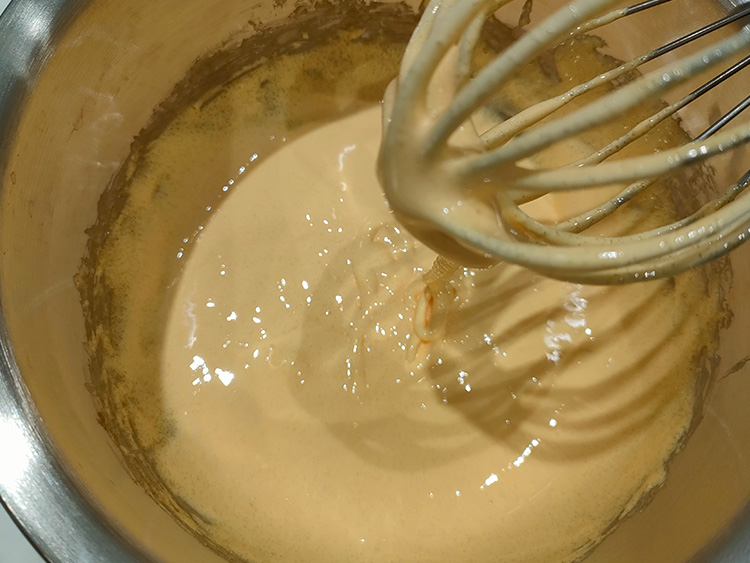 4ボウルに卵黄とグラニュー糖を入れ、泡立て器で白っぽくもったりするまで混ぜる。③を少しずつ加えながらむらなく混ぜる。