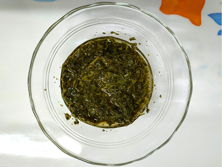 1茶殻、ブラックペッパー、塩、オリーブオイル、レモン汁を容器で混ぜ合わせます。