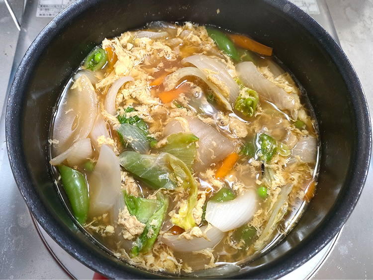 3ほうじ茶を入れたなべに、鶏ガラスープ、しょうゆ、塩コショウを入れ、ひと煮立ちさせたら、玉ねぎ、にんじんを加え再び煮立ったら中火で約2分煮て、スナップエンドウを加えて約1分煮ます。
