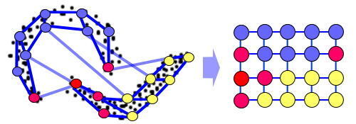 すでに述べたように、SOMデータマイニングでのクラスタリングにおけるSOMは、従来のクラスタ分析でK-meansと階層型クラスタリングを用いで2段階でクラスタリングを行う方法のK-meansのところをSOMに置き換えたものとみなすことができます。そもそもバッチ型SOMとK-meansはよく似たアルゴリズムです。K-meansの参照ベクトルがお互いに完全に独立していて(ばらばらに動いて)、グループの平均(重心)に厳密に移動するのに対して、SOMのノード(参照ベクトル)は、お互いに近傍関数によって格子状につなげられていて、(お互いが引っ張り合っていて)ばらばらに動くことはできずに、グループの平均ではなく、スムージング(平滑化)された値に移動するように学習がなされます。