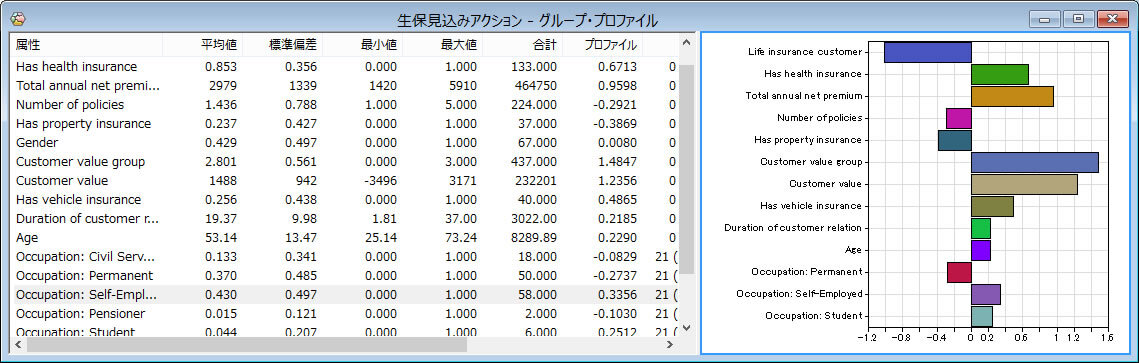 Viscovery SOMineでは、このプロファイル分析がとても素早く強力に行えます。マップ上で選択したグループと参照グループを比較して、選択したグループの統計的特徴を瞬時にグラフ表示することができます。グループの範囲は、ノード、クラスタ、近傍、選別、マップ全体の中から選ぶことができます。また参照グループも、グループ範囲を指定して、「参照グループを設定」ボタンを押すことで、任意の領域を参照グループとして設定できます。手順としては、まず参照グループを設定しておいて、任意のノードを選択し、(そのノードを含む)グループ範囲を選択することで、グループ・プロファイル・ウィンドウのグラフが比較の結果を表示します。