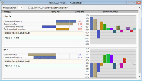 このほか、クラスタの特徴ウィンドウにクラスタごとの統計的特徴(各クラスタとマップ全体を比較)を一覧表示させることもできます。