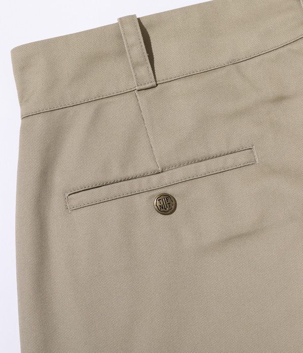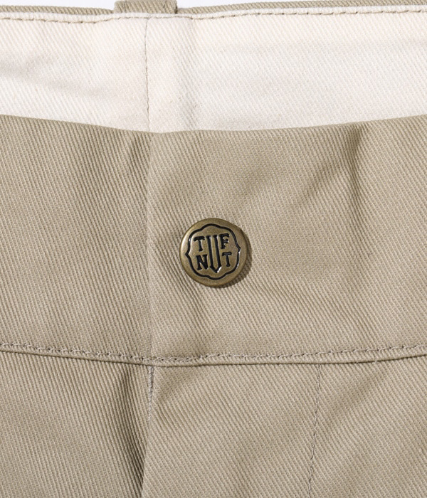 TUF-NUTのヴィンテージトラウザースは尿素ボタン仕様のものが多くみられるが、利便性を考慮してブランド名が刻印されたスナップボタンを採用している。