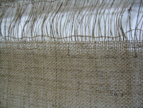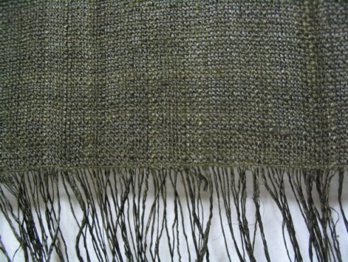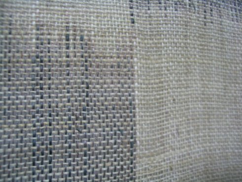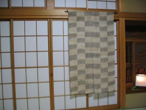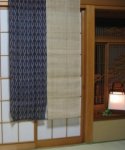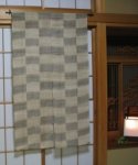 これは、うぐいす色と黒に程近いこげ茶の二色使いの、すかしの入った手織り麻のれんです。高級感のある玄人受けするタイプです。厚手の麻のため、重厚感があり、しっかりした、張りのある、それでいて、実際触った感触は、手織りの優しさをもつ何とも言えない暖かみを感じることができる一枚です。